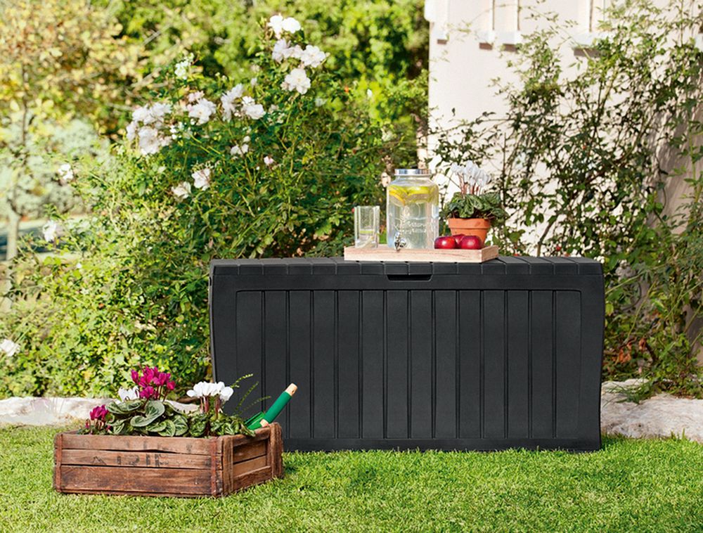 Cutie de plastic pentru depozitarea diverselor obiecte (perne, unelte de grădină...) de la KETER. Avantajul acestei cutii este asamblarea simplă (fără unelte - puteți asambla totul ca un kit), calitatea înaltă a cutiei și designul modern. Materialul are protecție UV și este rezistent la intemperii. Poate susține până la 220 kg, astfel încât îl puteți folosi și ca bancă.