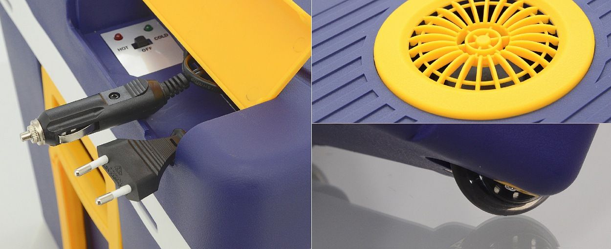 Cutie de răcire portabilă cu posibilitate de încălzire, alimentare cu energie de la o priză de brichetă auto de 12 V. sau de la o priză standard de 230 V. Este o cutie de răcire pe bază de termoelectric cu un sistem de răcire fără ventilator. În plus, sistemul este echipat cu un mod de încălzire, unde este posibilă menținerea unei temperaturi de 50 - 65 ° C în interiorul cutiei. Cutia de răcire este foarte ușor de transportat, este, de asemenea, echipată cu roți și un mâner extins pentru transport ușor. Cablurile de alimentare sunt depozitate într-o cutie practică care poate fi blocată direct în capac, așa că sunt întotdeauna la îndemână și totuși nu interferează niciodată.