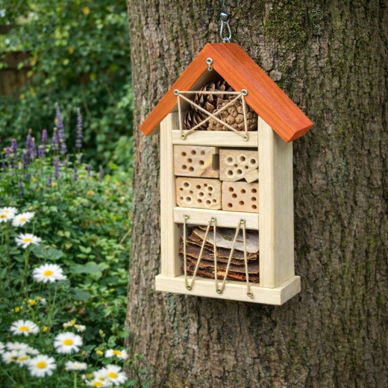 Se recomandă ca hotelul de insecte să fie amplasat la o înălțime mai mare de la sol, de preferință pe un copac sau pe un perete.