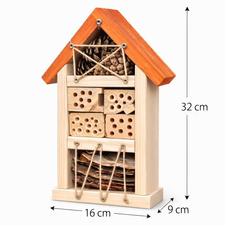 Vedeți descrierea mai detaliatăSe recomandă ca hotelul de insecte să fie amplasat la o înălțime mai mare de la sol, de preferință pe un copac sau pe un perete.