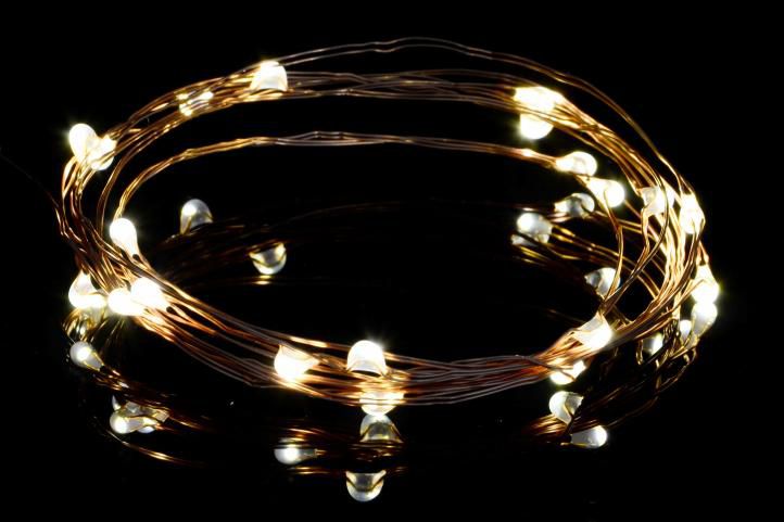 Mini LED-urile sunt montate pe un fir galben strălucitor, iar iluminarea este alimentată de la o priză electrică.