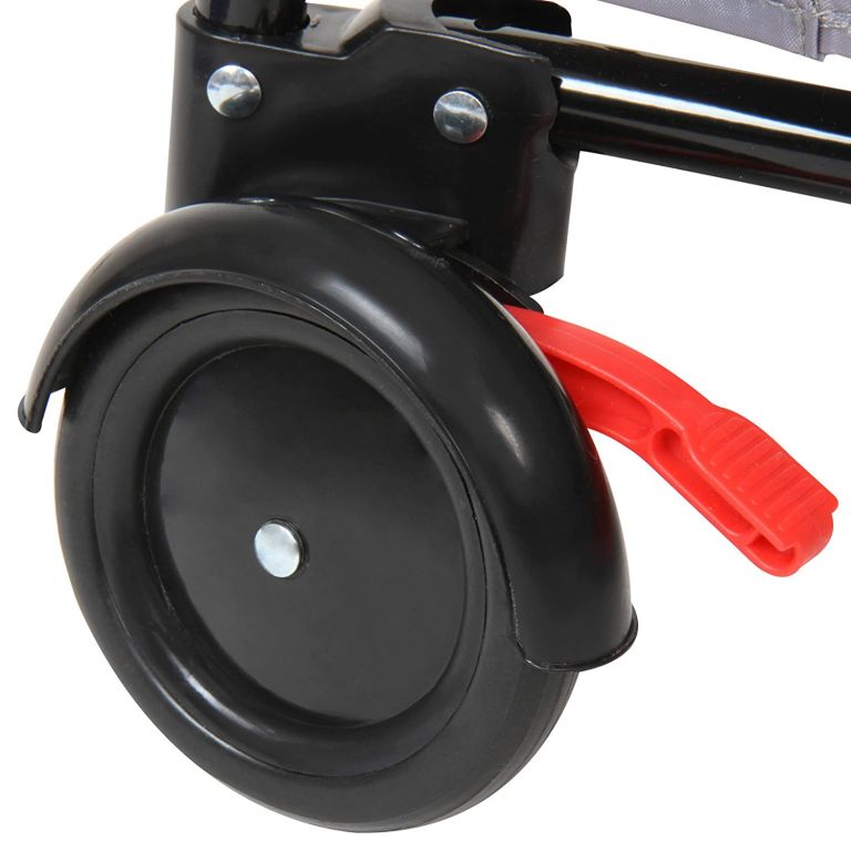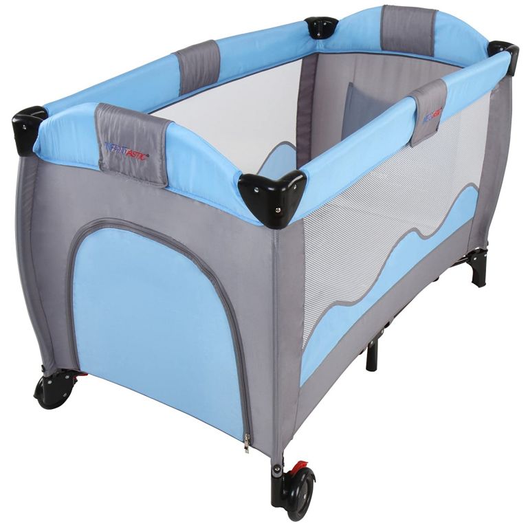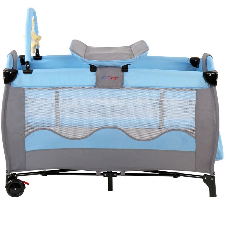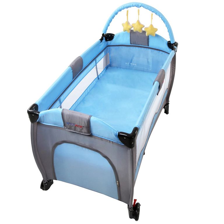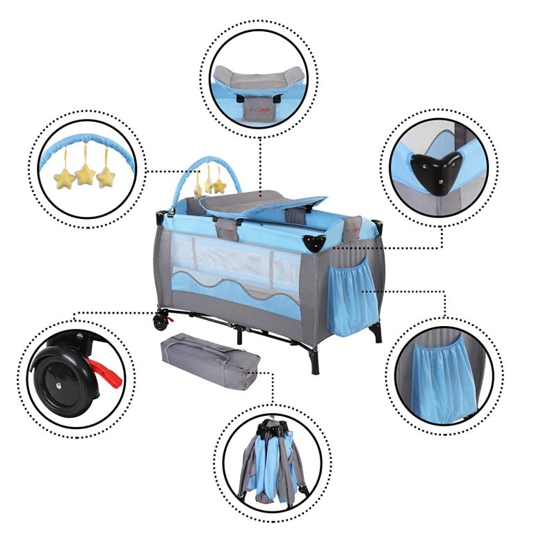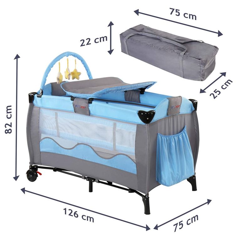 Pătuțul este ușor de asamblat și ușor de mutat datorită roților. Include o saltea de schimb, un arcadă de jucării și spațiu de depozitare.