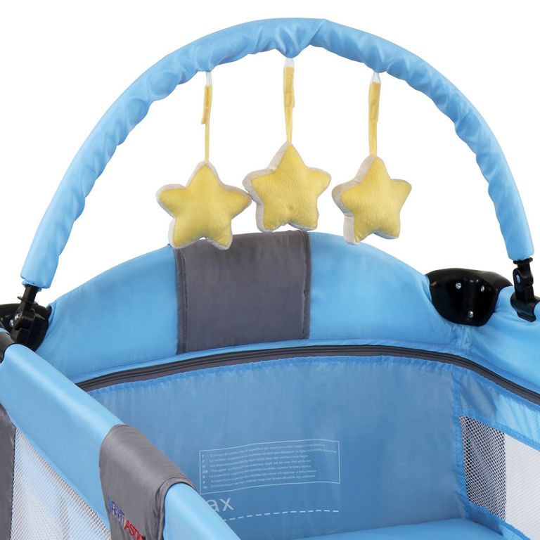 Acest pătuț este cu adevărat practic. Este echipat cu arcadă pentru jucării și o saltea căptușită. Arcada de jucării are stele de pluș agățate. Pătuțul are o intrare practică cu fermoar și spațiu de depozitare în față, margini căptușite și colțuri rotunjite. Este potrivit pentru copiii cu vârsta sub 36 de luni sau pentru o greutate maximă de aproximativ 15 kg. Husa lavabilă se întreține ușor. Patutul se pliază ușor.