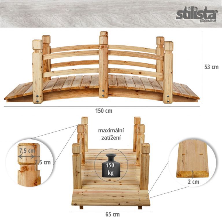 Datorită construcției sale solide, podul de lemn este extrem de stabil și robust și poate fi încărcat până la o greutate de aproximativ 150 kg. În plus, podul de grădină este încadrat de balustrade rustice. Datorită tratamentului prealabil cu un ulei de întreținere adecvat, podul este deosebit de rezistent la intemperii și durabil. Deoarece este un produs natural, crapaturilesi fisurile minore sunt un proces normal; îngrijirea regulată poate prelungi durata de viață a podului.