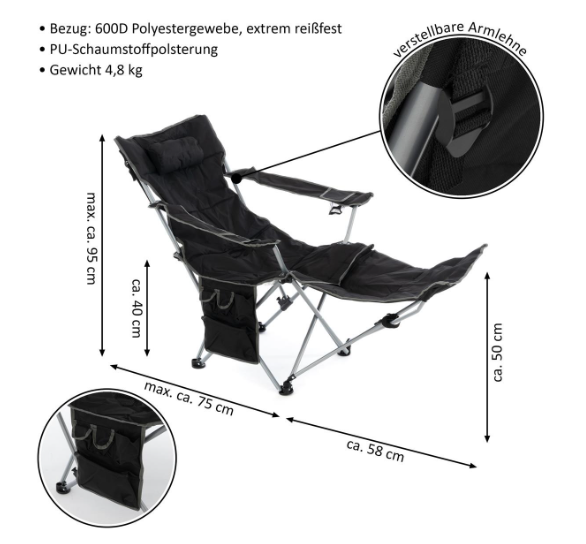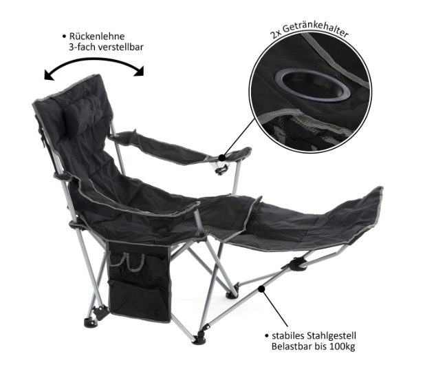 Scaun de camping sau scaun de camping - alege. Cu acest scaun de camping puteți sta într-o poziție relaxată ore întregi sau vă puteți întinde și vă puteți relaxa în lux. Scaunul este pliabil și ușor de transportat, gata de utilizare rapid și reambalat la fel de repede. Datorită geantei practice durabile, scaunul poate fi dus oriunde. Cele două suporturi pentru băuturi integrate în cotierele scaunului pliabil pot fi acoperite atunci când nu sunt utilizate și oferă o opțiune foarte utilă pentru depozitarea nu numai a cutiilor și a sticlelor, ci și a accesoriilor precum un telefon mobil. În plus, există un buzunar practic de depozitare cu fermoar și 3 buzunare pe lateralul scaunului.