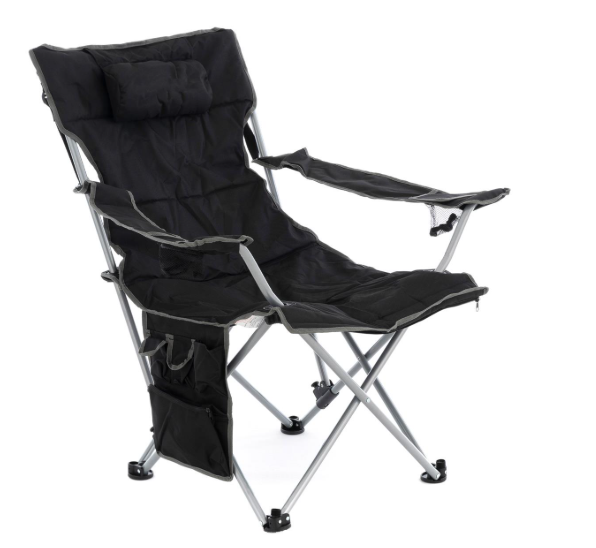 Scaun pliabil tapițat foarte confortabil cu pernă, cotiere largi și frumoase, suport pentru picioare detașabil și reglabil pe 3 poziții.