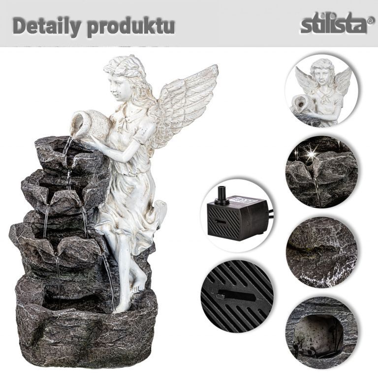 Fântâna decorativă "Angel" vă va transforma grădina sau terasa într-o oază de relaxare. Aceasta include o pompă cu funcționare lină, reglabilă continuu, care permite apei să curgă într-un circuit, astfel încât nu este nevoie să conectați apa de la conductă. Fântâna este fabricată din poliresină de înaltă calitate, rezistentă la intemperii și la razele UV.