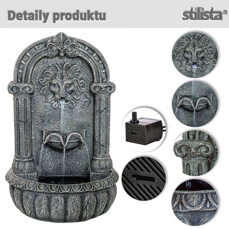 Fântâna decorativă de perete "Cap de leu" va transforma grădina sau terasa dvs. într-o oază de relaxare. Aceasta include o pompă cu funcționare lină, reglabilă continuu, care permite apei să curgă într-un circuit, astfel încât nu este nevoie să conectați apa de la conductă. Fântâna este fabricată din poliresină de înaltă calitate, rezistentă la intemperii și la razele UV.