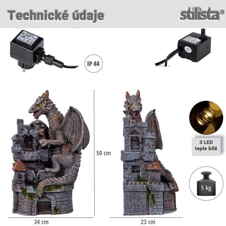 Fântâna decorativă „Dragon" îți va transforma grădina sau terasa într-o oază de bunăstare. Include o pompă reglabilă continuu cu funcționare lină, datorită căreia apa curge într-un circuit, astfel încât să nu fie necesară conectarea apei din comandă. Fântâna este realizată din polirășină de înaltă calitate, rezistentă la intemperii și la radiațiile UV.