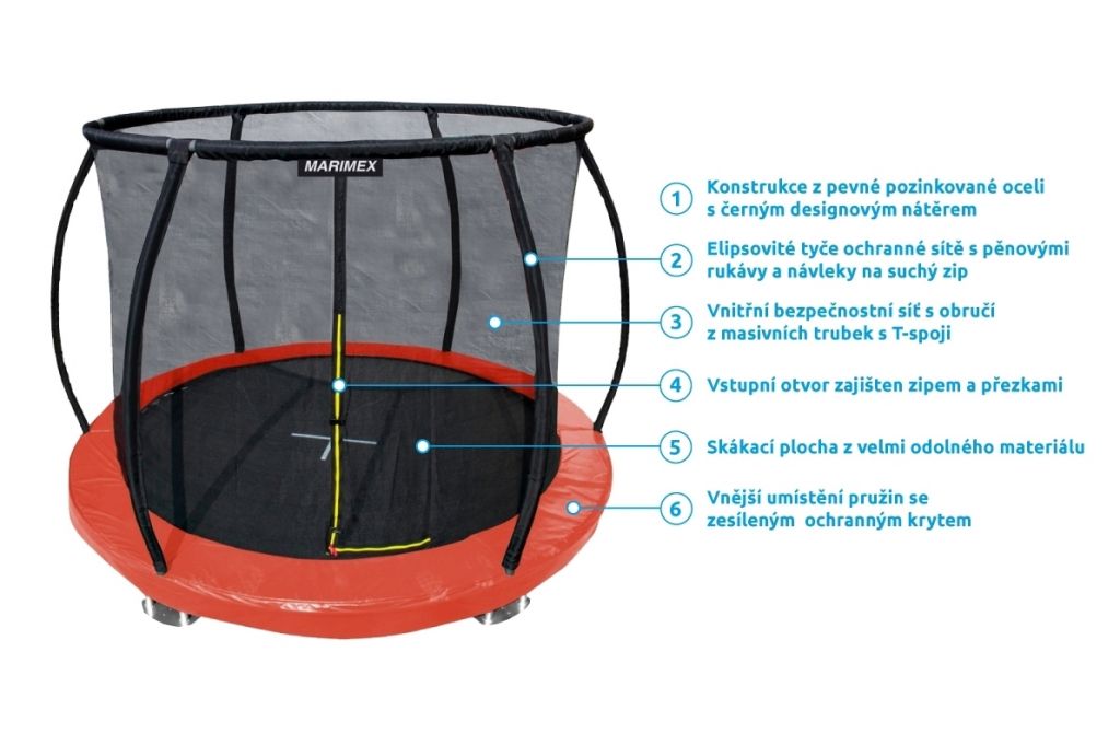 Stabilitatea perfectă a patinoarului este asigurată de șase suporturi plate cu o dimensiune de 300 x 145 mm. Grosimea suportului din oțel este de 3 mm. Trambulina este proiectată pentru a fi încorporată în pământ, unde suprafața de sărituri este la nivelul solului. Avantajul unei astfel de soluții este siguranța - nimeni nu poate intra sub suprafața de sărituri și se poate răni. Trambulinele pentru teren Marimex Premium nu se disting doar prin noul lor design și schema de culori, ci și prin stabilitate, rezistență și siguranță sporite. Stabilitatea crescută a trambulinelor Marimex Premium In-ground este obținută datorită solului adâncit. Siguranța este asigurată de protecții de primăvară întărite. Plasa de protecție interioară este susținută de opt bare îndoite dinamic și ținută întinsă de un cerc superior întărit. Suprafața de sărituri este realizată dintr-un material foarte durabil și neabraziv, cu o durată de viață lungă. Materialul suprafeței de sărituri este unul de cea mai bună calitate de pe piață. Suprafața este fabricată din polipropilenă specială cu protecție UV, ceea ce garantează o durată de viață lungă. Un tratament special de suprafață neabrazivă (netedă) previne abraziunea pielii la impact. Plasa de protecție interioară poate fi găsită direct în pachet, nu trebuie să o cumpărați separat. Plasa de protecție interioară este mai sigură decât plasa exterioară - împiedică accesul săritorului la secțiunea cu arc. Zona de intrare este fixată cu trei catarame și previne căderea. Barele sunt învelite cu un manșon de protecție din spumă moale. Picioarele trambulinei sunt separate și sporesc stabilitatea întregii trambuline. Legătura dintre barele picioarelor de trambulină și plasă este fixată cu ajutorul unor cleme speciale.