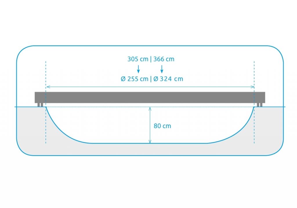 Construcția trambulinei încastrate: Adâncimea minimă a gropii de sub trambulină: 80 cm (se recomandă căptușirea acesteia cu geotextil) și diametrul gropii: 324 cm. Vă rugăm să citiți cu atenție instrucțiunile înainte de a asambla trambulina.