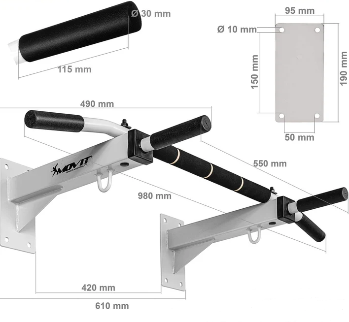 Cu suportul de perete MOVIT Profi pentru montare pe perete, puteți efectua diverse exerciții care întăresc mușchii brațelor, umerilor, abdomenului și spatelui. Structura pătrată extrem de stabilă din oțel cu unghiuri sudate este fixată în siguranță de perete cu 8 șuruburi hexagonale de înaltă calitate (60 x 12 mm) din clasa de rezistență 8.8 și dibluri adecvate (incluse în livrare), ceea ce permite o sarcină maximă până la 350 kg! Cu materialul de fixare inclus, șina de perete poate fi fixată imediat pe perete și poate începe antrenamentul. Instalarea este permisă numai pe pereți adecvați (de ex. Beton sau piatră) care sunt adecvate pentru greutatea corespunzătoare (nepotrivit pentru pereți de gips-carton, pereți despărțitori goi sau ipsos).