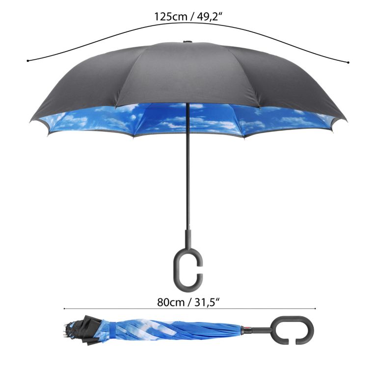 Datorită tehnologiei inverse, puteți deschide umbrelă aproape fără a avea nevoie de spațiu. Deci, de exemplu, atunci când stai într-o mașină, poți ține umbrela de pe ușa întredeschisă cu o mână și o poți deschide apăsând un buton. Deci nici un strop de ploaie nu te va lovi. Metoda opusă funcționează, de asemenea, mult mai atent decât cu umbrelele convenționale de buzunar. Prin coborarea fundului, suprafața umedă dispare. Apartamentul, restaurantul sau mașina dvs. vor rămâne întotdeauna uscate. Dar asta nu este tot, deoarece această umbrelă cu design inovator este echipată cu tehnologie nanomembrană cu două straturi. Este format din mătase brută de înaltă calitate și extrem de densă, care este conectată la o membrană de vinil impermeabilă. Prin urmare, umbrela este întotdeauna impermeabilă și rezistentă la vânt. Datorită construcției sale stabile, poate fi folosit chiar și în condiții de vânt. Mânerul unic în C vă permite să purtați o umbrelă la încheietura mâinii, cu ambele mâini libere. Împachetați împreună și pur și simplu eliminați picăturile de ploaie.